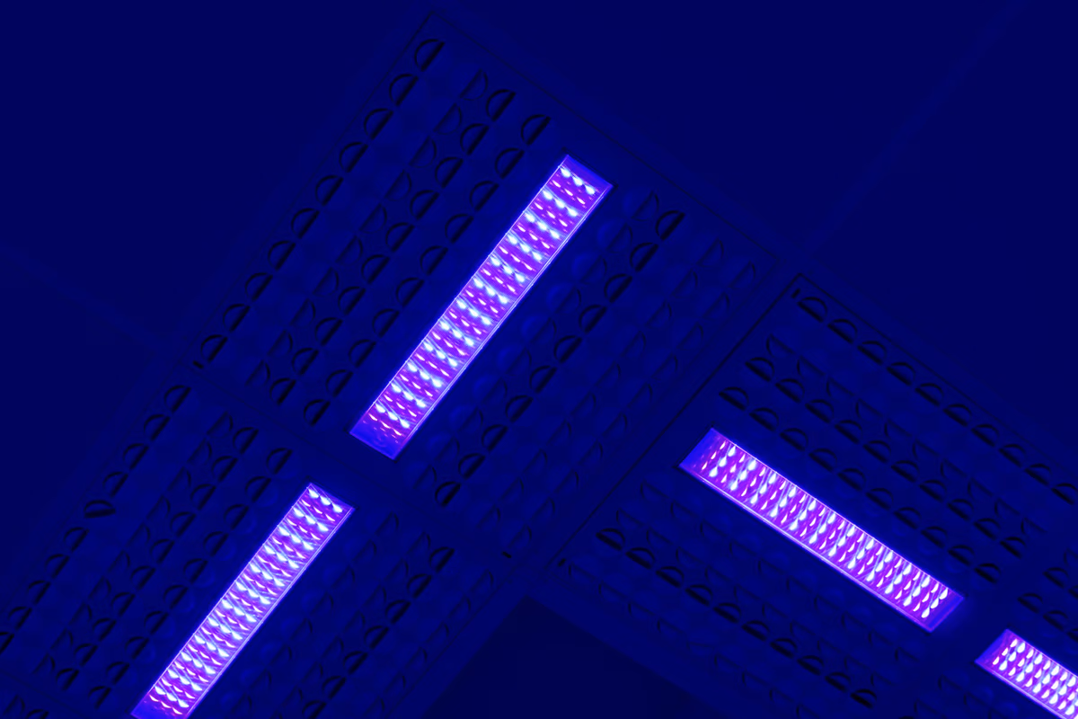 The intensity of disinfection blue light at the surfaces and the illumination time is calculated for each project individually based on the dimensions of the room and the way people use the space.