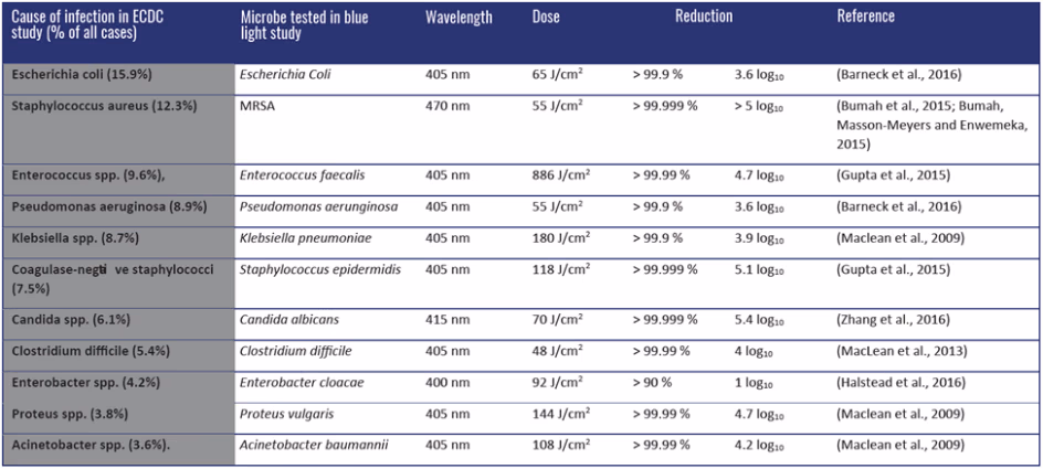 This table lists the most common causes of healthcare-acquired infections (HAI) in Europe, according to the European Centre for Disease Prevention and Control (ECDC). The ECDC conducted a study from 2011–2012 on vectors of healthcare-associated infections in 273,753 patients in 1,149 hospitals in 29 European countries. The table also contains data on the efficiency of blue light inactivation of microbes collected from different sources. Although different microbes respond differently to blue light, it is nevertheless fatal to all of them.