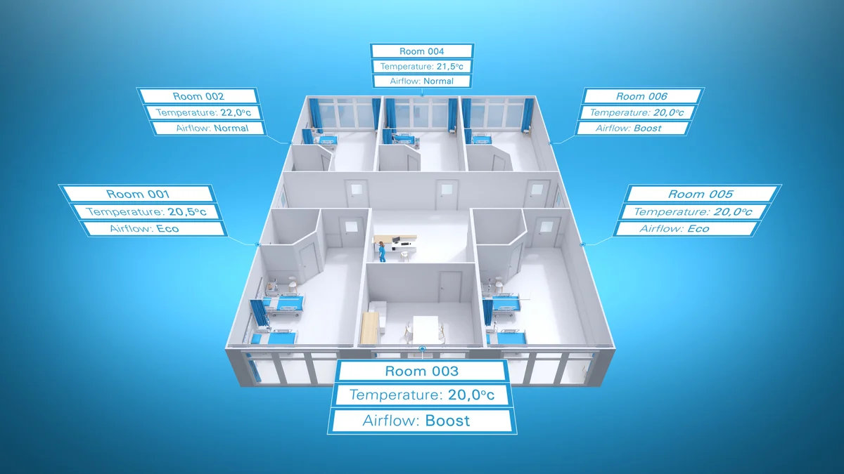 在现代化医院中,良好的室内环境和患者的舒适度对于患者的快速康复至关重要。为了确保这样的环境,浩盾(Halton)打造了采用卫生冷梁和辐射板的Vita病房解决方案。浩盾 Vita病房解决方案可为病房提供灵活而安静的通风,符合严格的卫生标准,并为病患和医护人员提供更高的安全性。浩盾Vita病房解决方案提供了一种自动化功能,可轻松控制病房的状况(气流、温度和照明)。