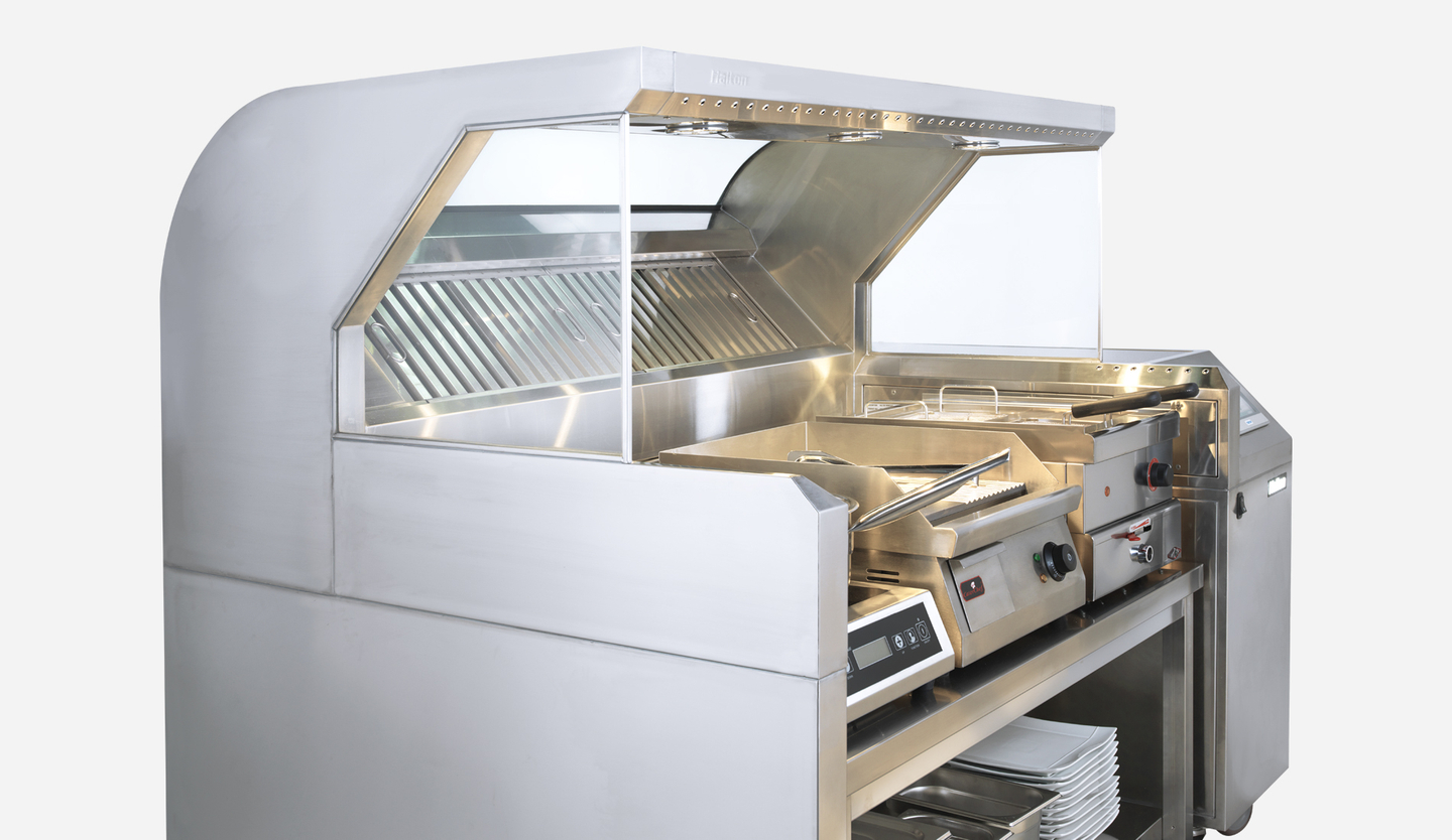 Bei Halton MobiChef handelt es sich um eine steckerfertige, hocheffiziente und völlig unabhängige mobile Kochstation. Entkoppelt vom Lüftungssystem, tritt die Kochshow in traditionellen Speisebereichen in den Mittelpunkt, unabhängig von Frontcooking-Stationen .