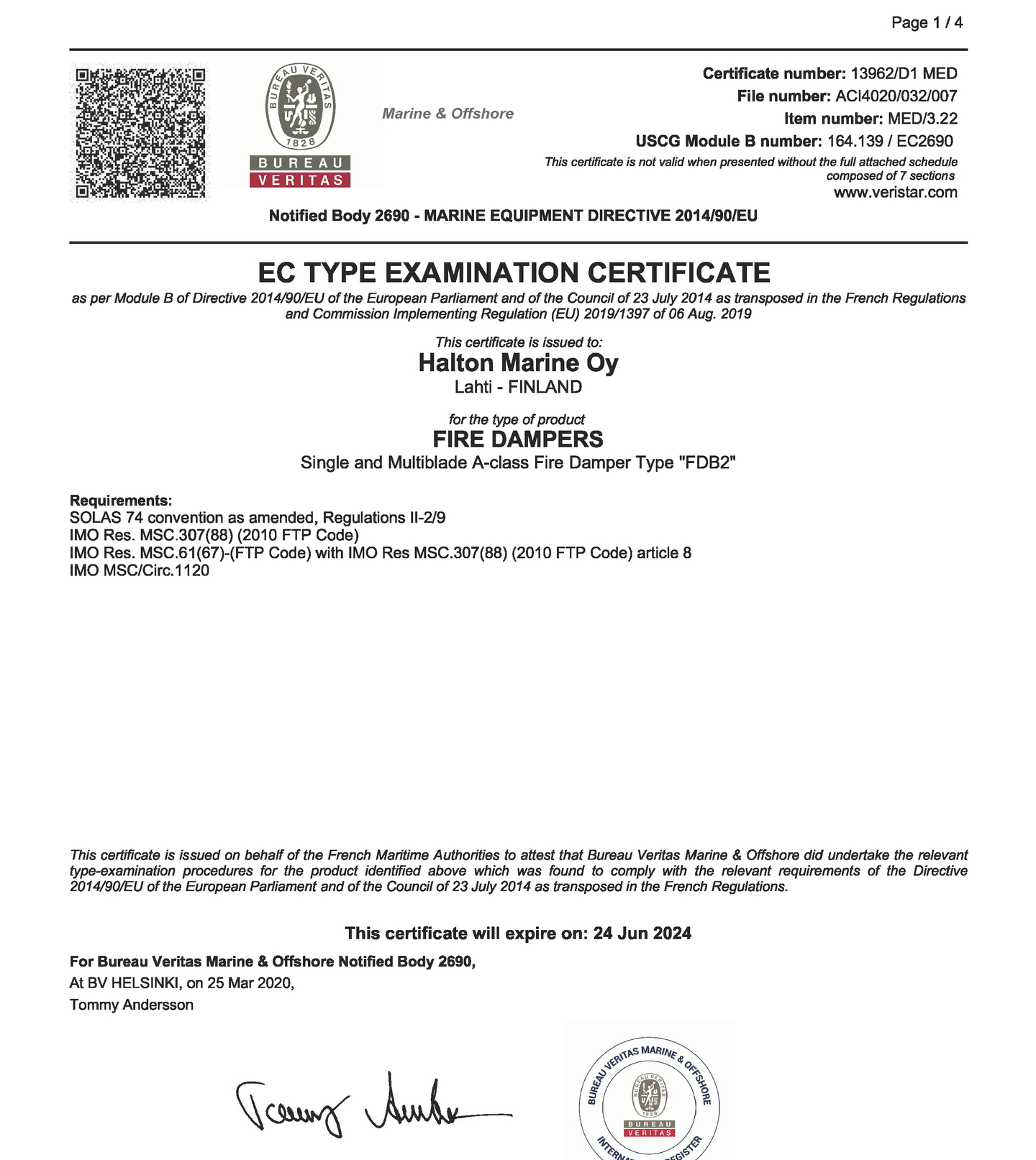 MED BV Certificate for Halton FDO