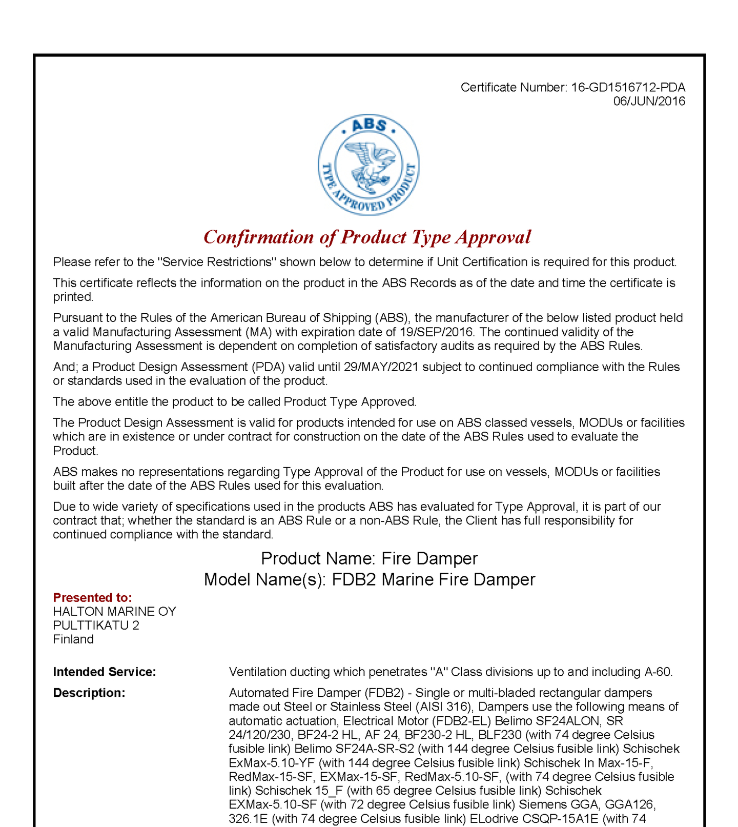 ABS Certificate for Halton FDB2