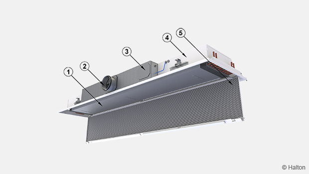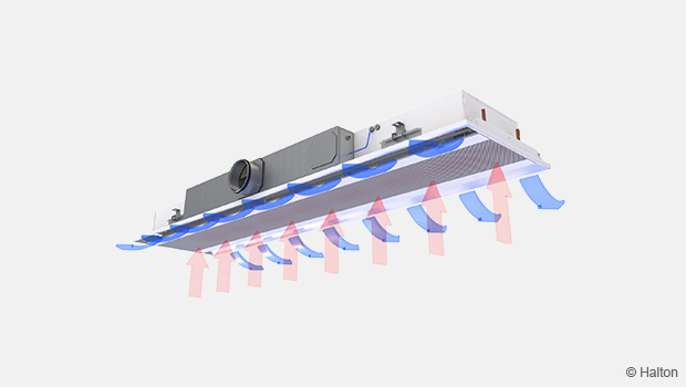 Tuloilmasuihkut indusoivat tehokkaasti mukaansa ympäröivää huoneilmaa, ja ne ohjataan vaakasuuntaisesti katon pintaa pitkin. Sekundääri-ilma kulkeutuu palkin alapinnassa olevan rei’ityksen läpi. Tämän jälkeen ilma virtaa lämmönsiirtimeen, jossa se joko jäähtyy tai lämpenee ennen kuin se tuodaan huonetilaan.