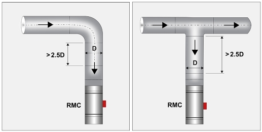 Vaadittava vähimmäisetäisyys mutkan tai T-haaran jälkeen on 2.5 x kanavan halkaisija.
