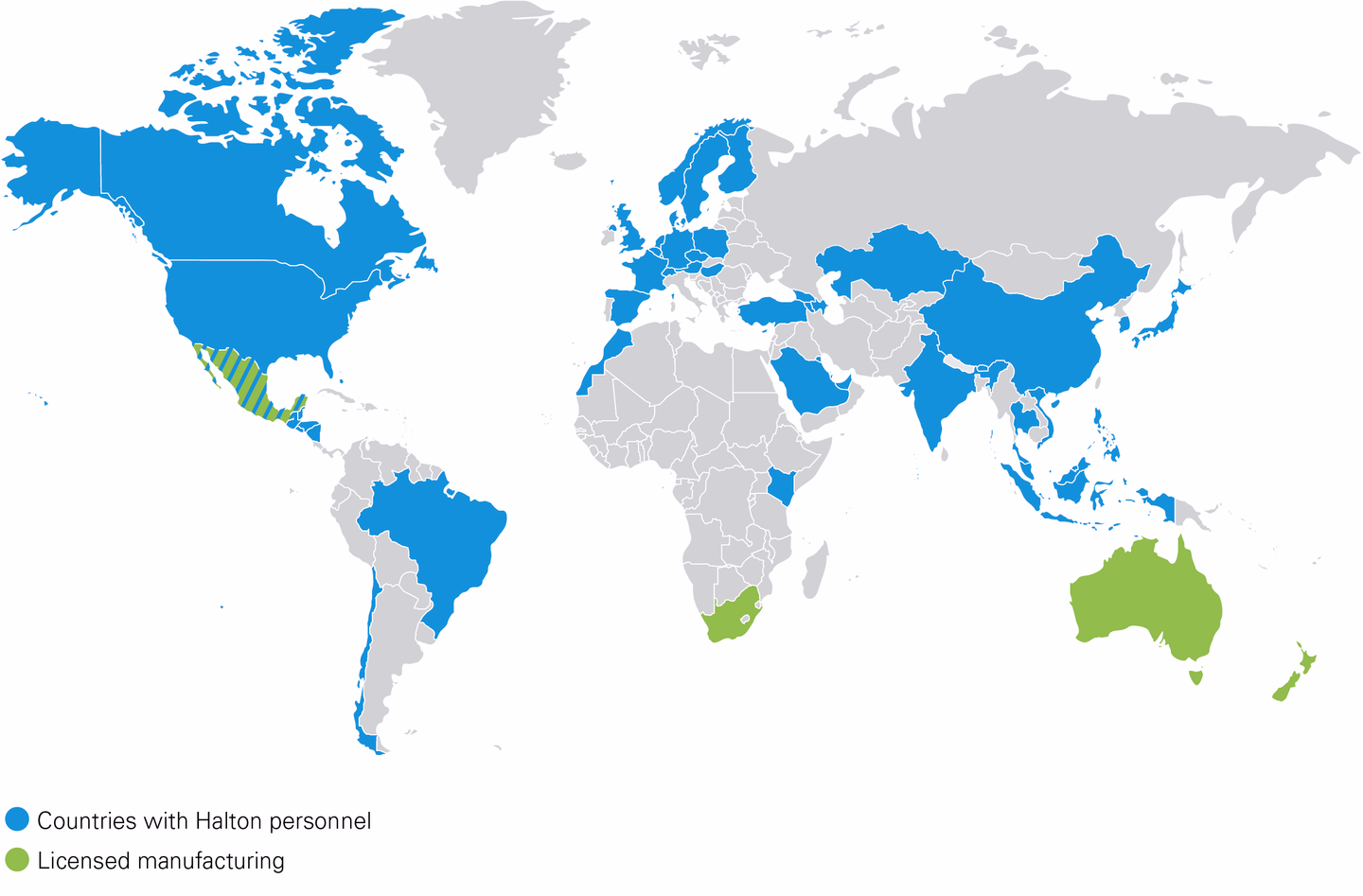 Meillä on tuotantoyksiköitä yhdeksässä maassa: Suomessa, Ranskassa, Saksassa, Isossa-Britanniassa, USA:ssa, Kanadassa, Kiinassa, Malesiassa ja Brasiliassa. Lisäksi Haltonilla on tutkimus- ja tuotekehitysyksiköitä kahdeksassa näistä maista. Lisensoitu tuotanto tapahtuu Etelä-Afrikassa, Meksikossa, Uudessa-Seelannissa ja Australiassa.
