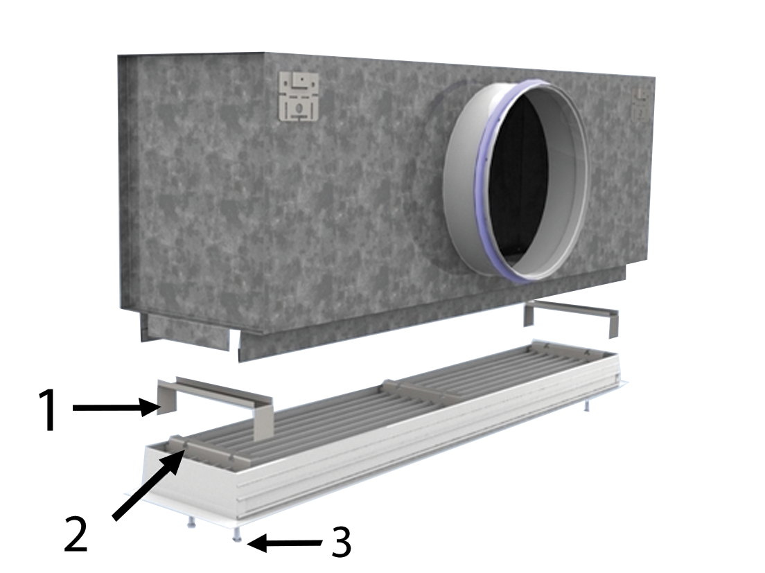 La fixation des diffuseurs dans le plénum se fera au moyen d’étriers de montage, permettant ainsi le réglage en altimétrie du diffuseur et garantissant ainsi une planéité totale avec le faux-plafond.