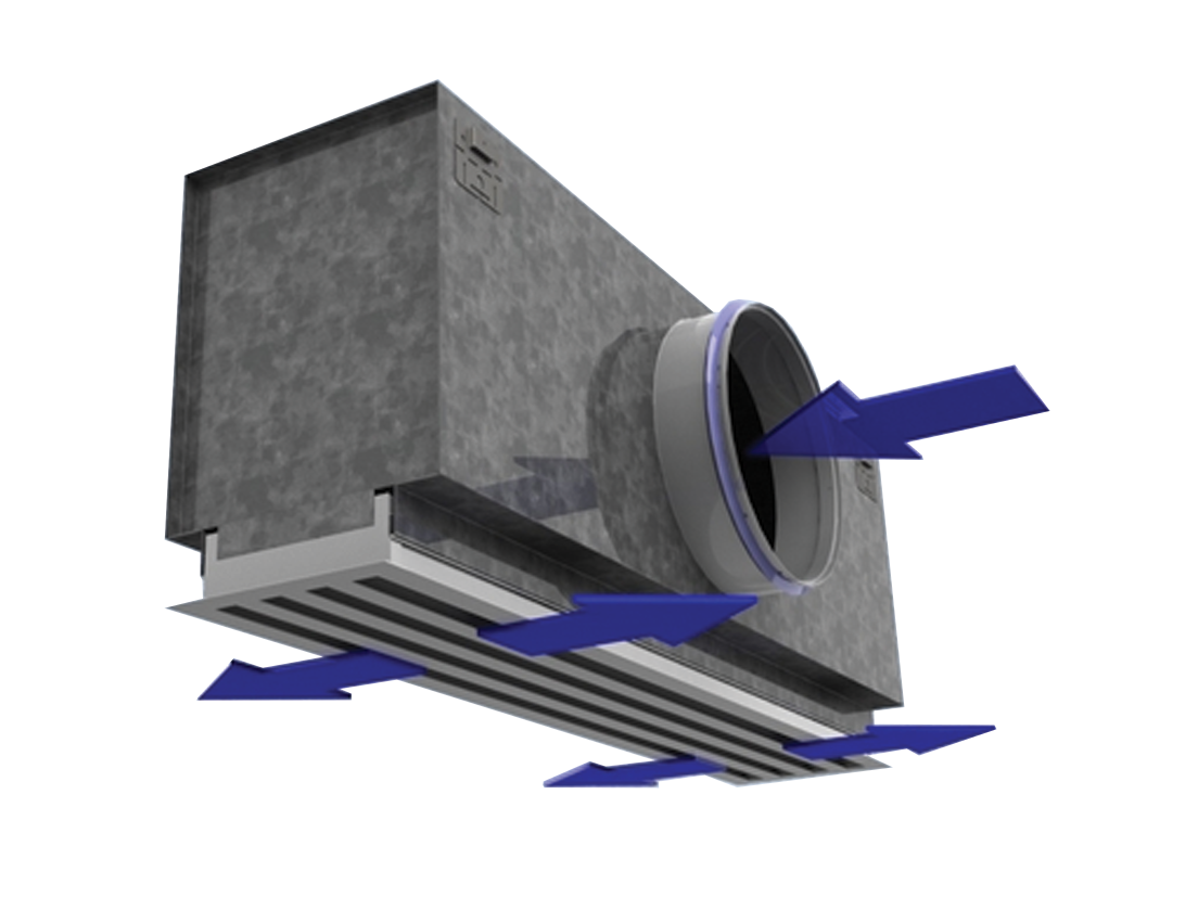 L’air de soufflage est diffusé au travers des fentes du diffuseur, soit horizontalement avec effet de plafond, soit verticalement en projection.