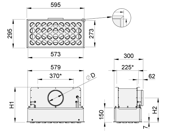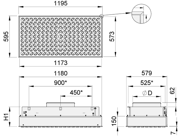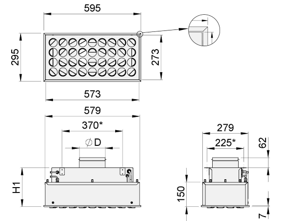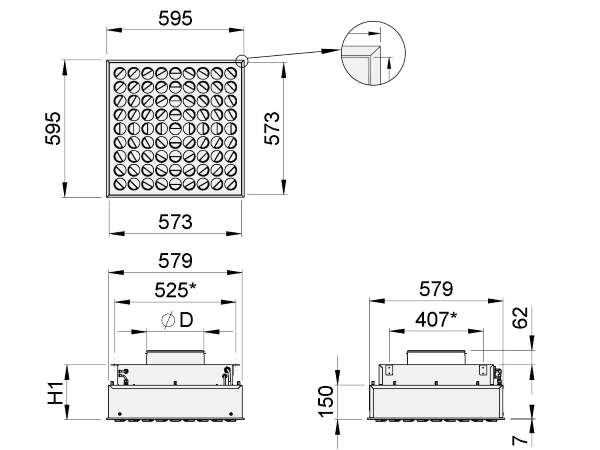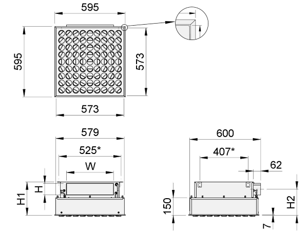 Le diffuseur est également disponible avec une plaque frontale entièrement perforée pour l’alimentation ou l’évacuation d’air verticale. Le diffuseur est conçu pour être équipé d’un filtre HEPA avec un joint en mousse de polyuréthane (PUR) ou, en alternative, d’un joint en gel de polyuréthane (GEL).