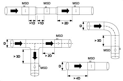 Respecter les distances de sécurité indiquées entre les accidents (p ex coudes, raccords en T) et la section de mesure pour augmenter la précision de mesure. Consulter les figures ci-dessous pour le positionnement recommandé.