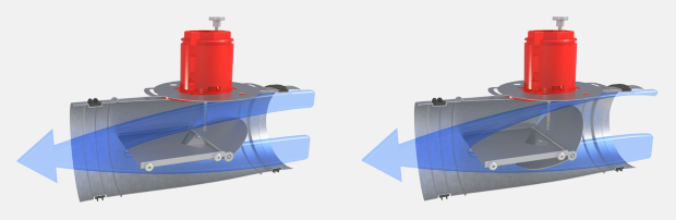 Si la pression dynamique de la branche de gaine augmente, le volet tourne, ce qui augmente la perte de charge et empêche le débit d’augmenter sensiblement. Inversement, si la pression dynamique de la branche de gaine diminue, le ressort ramène le volet en position ouverte, ce qui diminue la perte de charge et maintient le débit constant (comme le montre la figure ci-dessous).