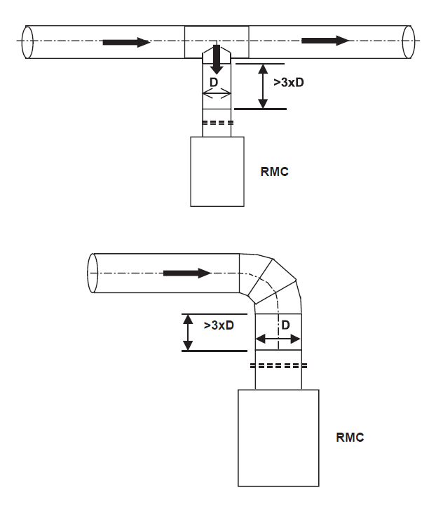 La distance de sécurité nécessaire après un coude ou un raccord en T est de 3 le diamètre de la gaine.