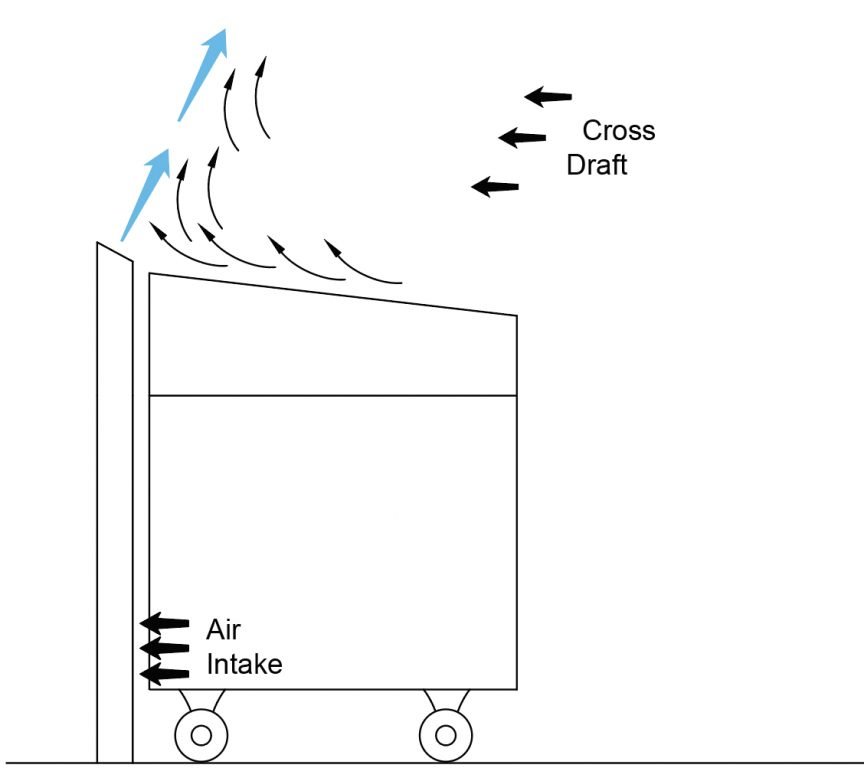 The Jets created by the side and front Capture Bar modules prevent the croos draugt dispering the smoke until captured by the Capture Jet™ hood or ventilated ceiling installed above the cooking appliances. An overhang between the back of the hood and the back of the cooking equipment is still required.