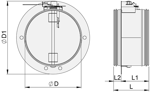 In Halton Exe Light Circular fire damper with mechanical spring release (Fig.1.), the fuse reacts to the rise of temperature (70 ºC) and the mechanical spring closes the blade of the damper. It needs to be opened manually.