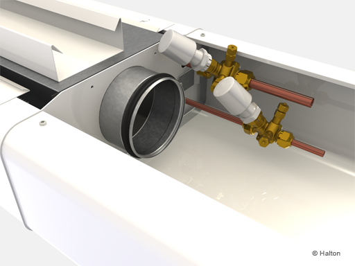 The appearance of different units - with constant, adjustable, or variable airflow - is identical. The Halton Air Quality control unit's position and the selection of the chilled beam nozzle size allow adjustment of the primary airflow rate in the space. Airflow adjustment damper (e.g. Halton PTS) can be used for balancing the airflow.