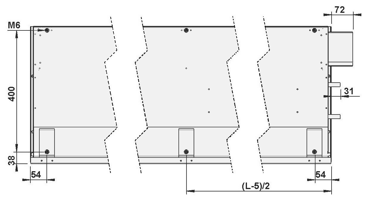 The chilled beam can be attached directly to the ceiling surface (H1 = 80 mm) or suspended using threaded drop rods (8 mm). Each beam is equipped with movable brackets fixed to both sides of the beam. It is recommended that the brackets be positioned one quarter of the unit length (L/4) away from the end of the beam.