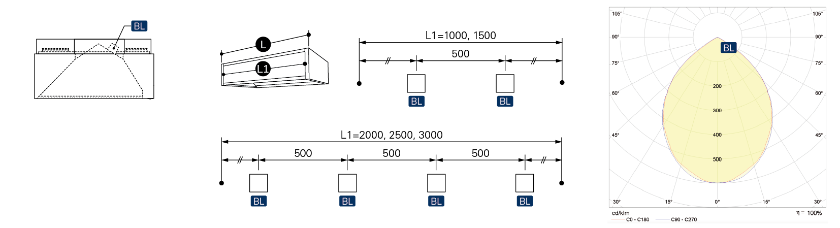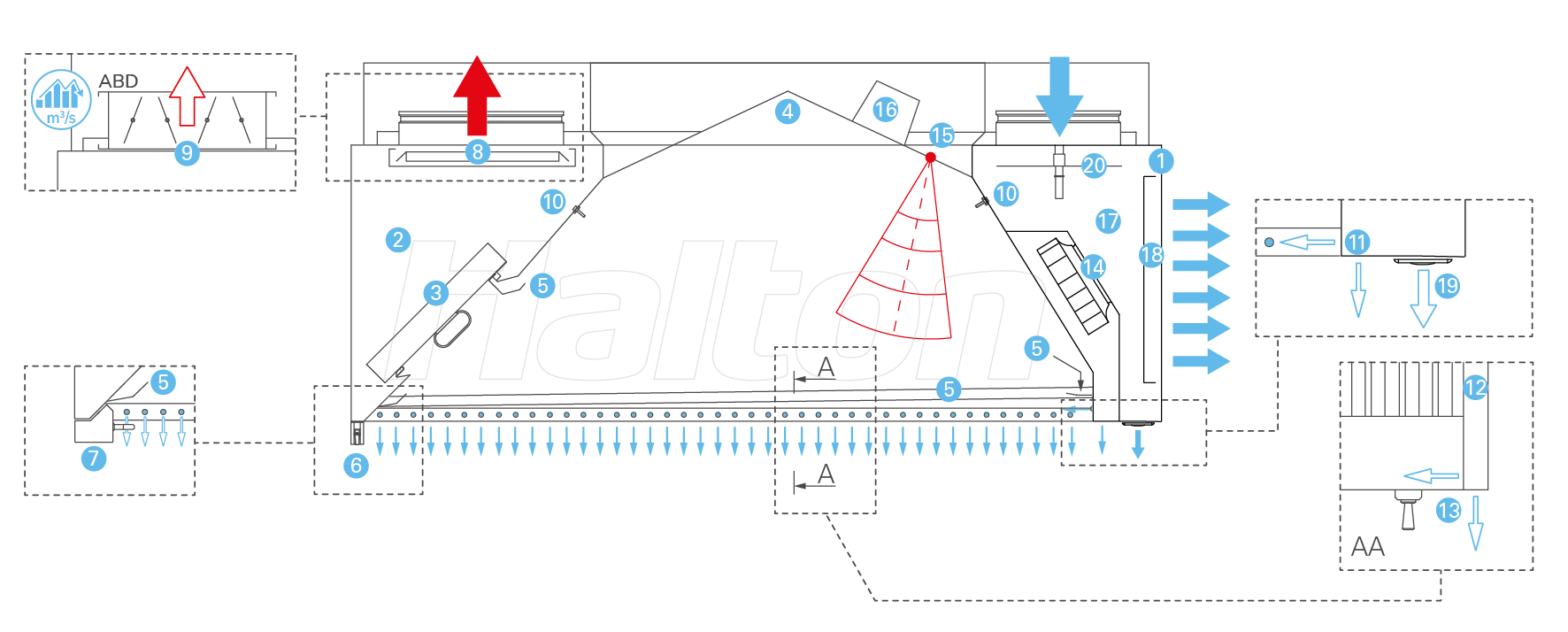 - Halton Skyline LED culinary LED spots flush-mounted on the hood roof (with individual protective cover on top).