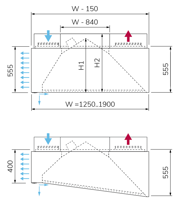 (1) This scale is indicative and based on wall mounted hoods, opened on 3 sides, equipped with a same cooking bloc, whatever it is. The variation in exhaust airflow reduction for a given hood type is due to the makeup-air type (mixing or displacement). Other parameters do impact the final airflow rates. Our sales teams are at your disposal to provide you with a calculation note, depending on your kitchen configuration.