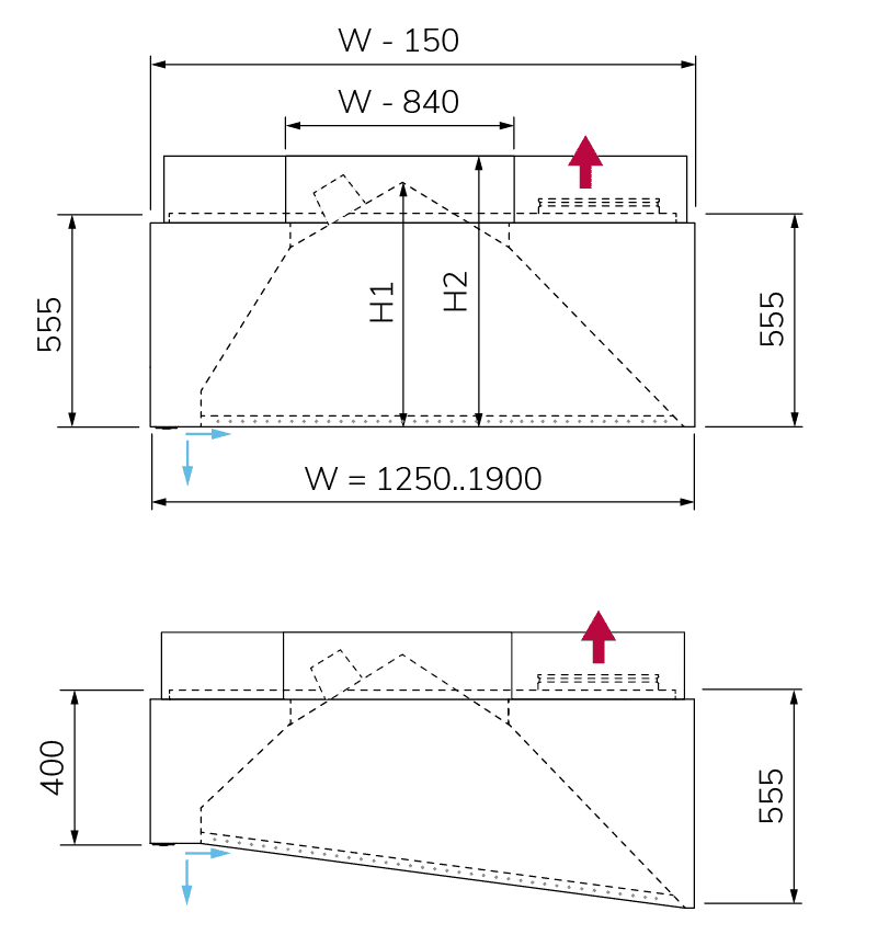 (1) This scale is indicative and based on wall mounted hoods, opened on 3 sides, equipped with a same cooking bloc, whatever it is. The variation in exhaust airflow reduction for a given hood type is due to the makeup-air type (mixing or displacement). Other parameters do impact the final airflow rates. Our sales teams are at your disposal to provide you with a calculation note, depending on your kitchen configuration.