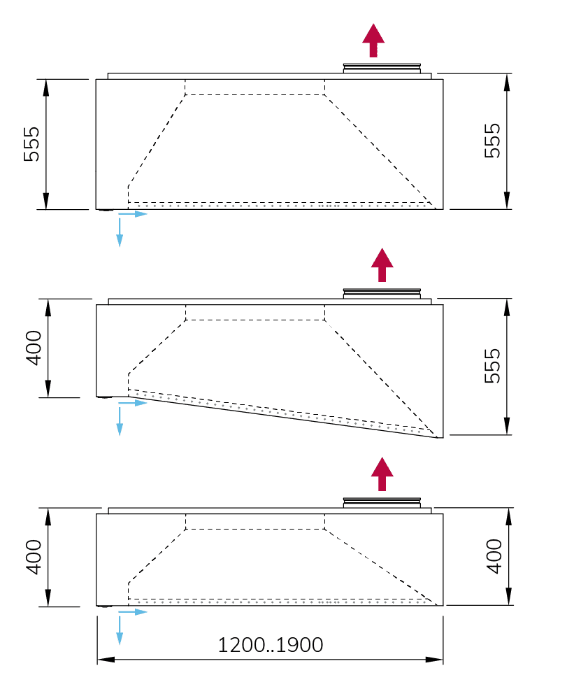 (1) This scale is indicative and based on wall mounted hoods, opened on 3 sides, equipped with a same cooking bloc, whatever it is. The variation in exhaust airflow reduction for a given hood type is due to the makeup-air type (mixing or displacement). Other parameters do impact the final airflow rates. Our sales teams are at your disposal to provide you with a calculation note, depending on your kitchen configuration.