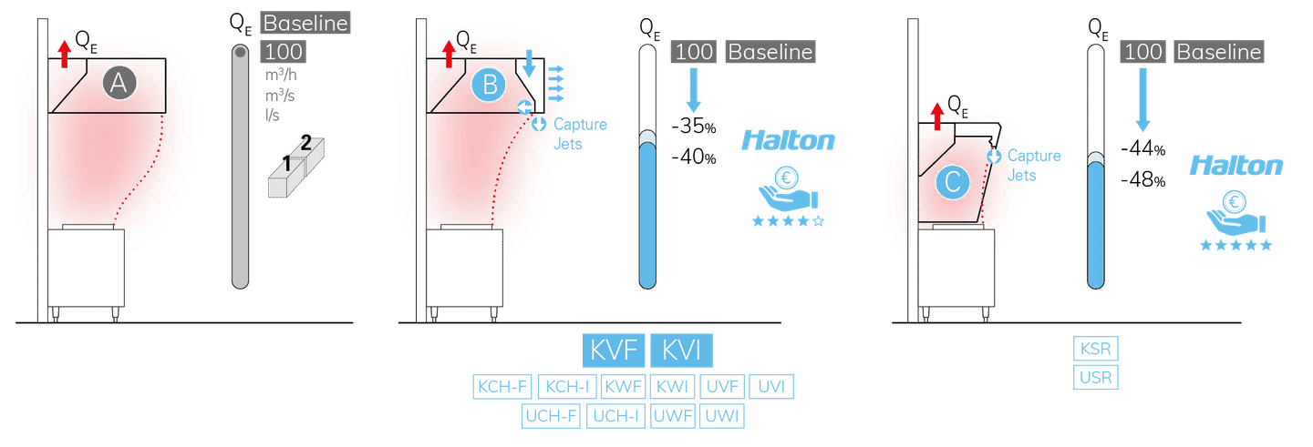 KVI hood reduces the exhaust airflow rates(1) by up to 40% compared to traditional hoods.