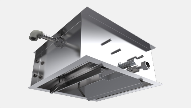 The damper shall be adjustable to allow for balancing airflow based on pressure differential readings from integral T.A.B. test and balance port in the Capture Jet hood. The damper outer casing shall be constructed of continuously welded 16ga. galvanized steel including the balancing blades. Optional construction is of 18ga. stainless steel. Adjustment of the parallel dampers (in open position) will be achieved by manually turning the locking adjustment