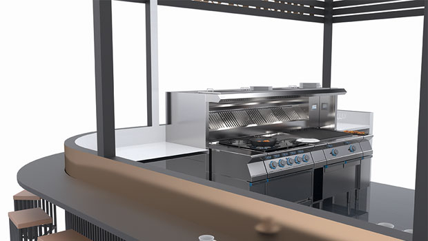 ModularChef finds also its place in kitchens with normal ceiling heights, With the additional benefit of promoting the feeling of openness. Its compact design makes it also especially suitable to front and show cooking concepts. It is an aesthetic solution that makes the chefs and guests closer.