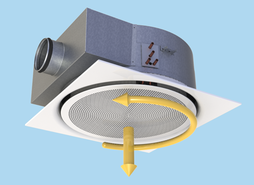 The primary supply air enters the plenum of the swirl comfort unit, from which it is diffused into the room with a swirl effect through nozzles and supply slots at the bottom of the swirl comfort unit. Nozzles are in a circle supplying air 360º radially. The supply air nozzle jets efficiently induce ambient room air. Induced air flows through the heat exchanger, where it cools. The supply air jet is supplied from the nozzles, creating swirl functioning. Some of the nozzles are openable, to enable different supply airflow rates.