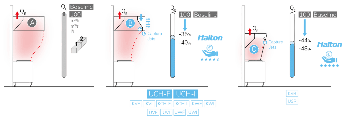 UCH-I hood reduces the exhaust airflow rates(1) by up to 40% compared to traditional hoods.