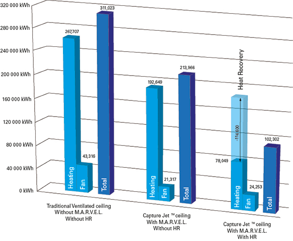 The first one is emblematic. M.A.R.V.E.L. « scans » the surface of the cooking blocks to determine, in real time, the status of the appliances: switched off, idle or in the process of cooking. Each status corresponds to a different exhaust airflow need. The maximum value is used only in cooking mode, for a limited time period. This leads to a first drastic reduction of the exhaust airflows.