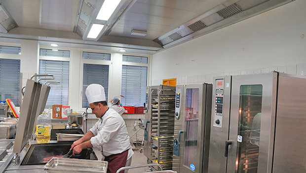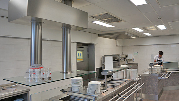The main kitchen and the dishwashing areas have been equipped with Capture Jet™ ventilated ceilings enabling up to 15% reduction in exhaust airflow rates compared to traditional ventilated ceilings. The distribution area has been on its side equipped with a Capture™ Jet hood (up to 40% reduction in exhaust airflow rate compared to traditional hoods) and a Jet Extraction System (JES).