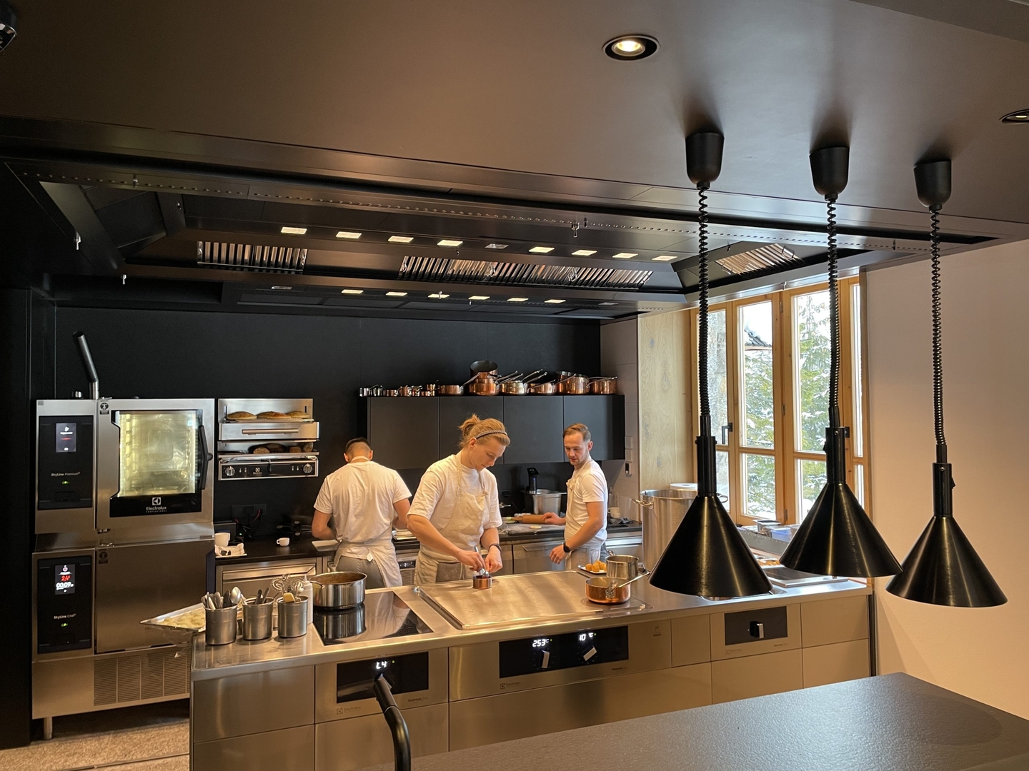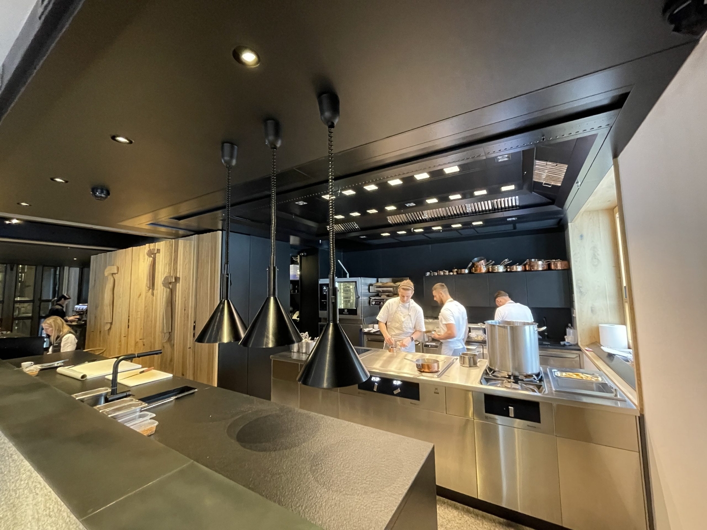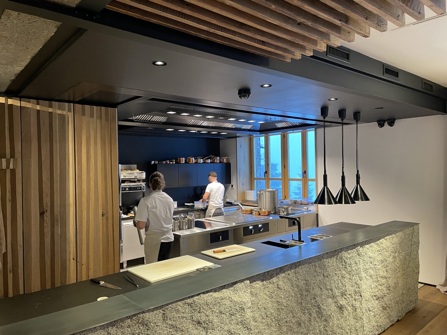 The restaurant is one place in the centre of the hotel, with an open kitchen and a communal table, allowing guests to enjoy the display of different cooking techniques.
