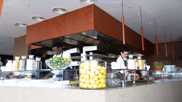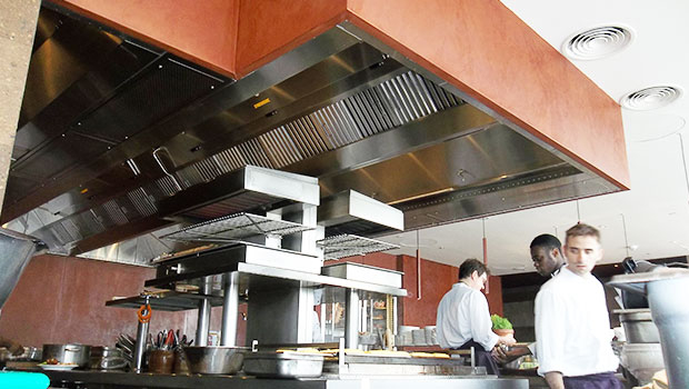 – A high end front of house cooking experience, enabling customers to walk through the kitchen, watching the chefs in action, whilst walking to their tables. This show kitchen concept was based on demanding heavy duty char grilles, Josper Oven and Rotisseries. Halton had to look at a mix of both Cold Water Mist and UV technologies as the primary filtration within the canopies. This, mixed with the Capture Jet™ technology would provide the most efficient solution in a highly challenging area. The show kitchen canopy being decoratively clad, supply air had to be introduced via other means, without affecting the balance of the kitchen area.