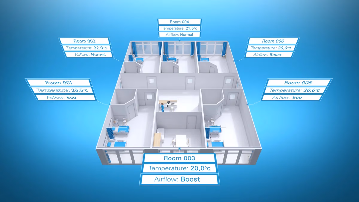 The Halton Vita Patient Room HVAC solution is purpose-built for hospital and healthcare environments, designed to promote faster recovery by creating optimal indoor conditions. This advanced system integrates ventilation, heating, and cooling to maintain a stable thermal environment, ensuring maximum patient comfort and well-being. With intelligent demand-controlled ventilation, airflow is automatically adjusted based on room occupancy. During visiting hours or medical consultations, ventilation levels increase to accommodate more people. When the patient is alone, the system seamlessly returns to energy-efficient levels – supporting both comfort and sustainability.
