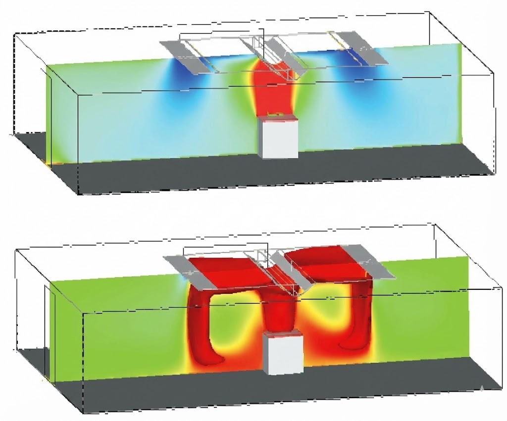 • WITHOUT Capture Jets (bottom), the convective flows are not immediately evacuated and spread along the ceiling, to then recirculate with the air supplied by the Supply modules.