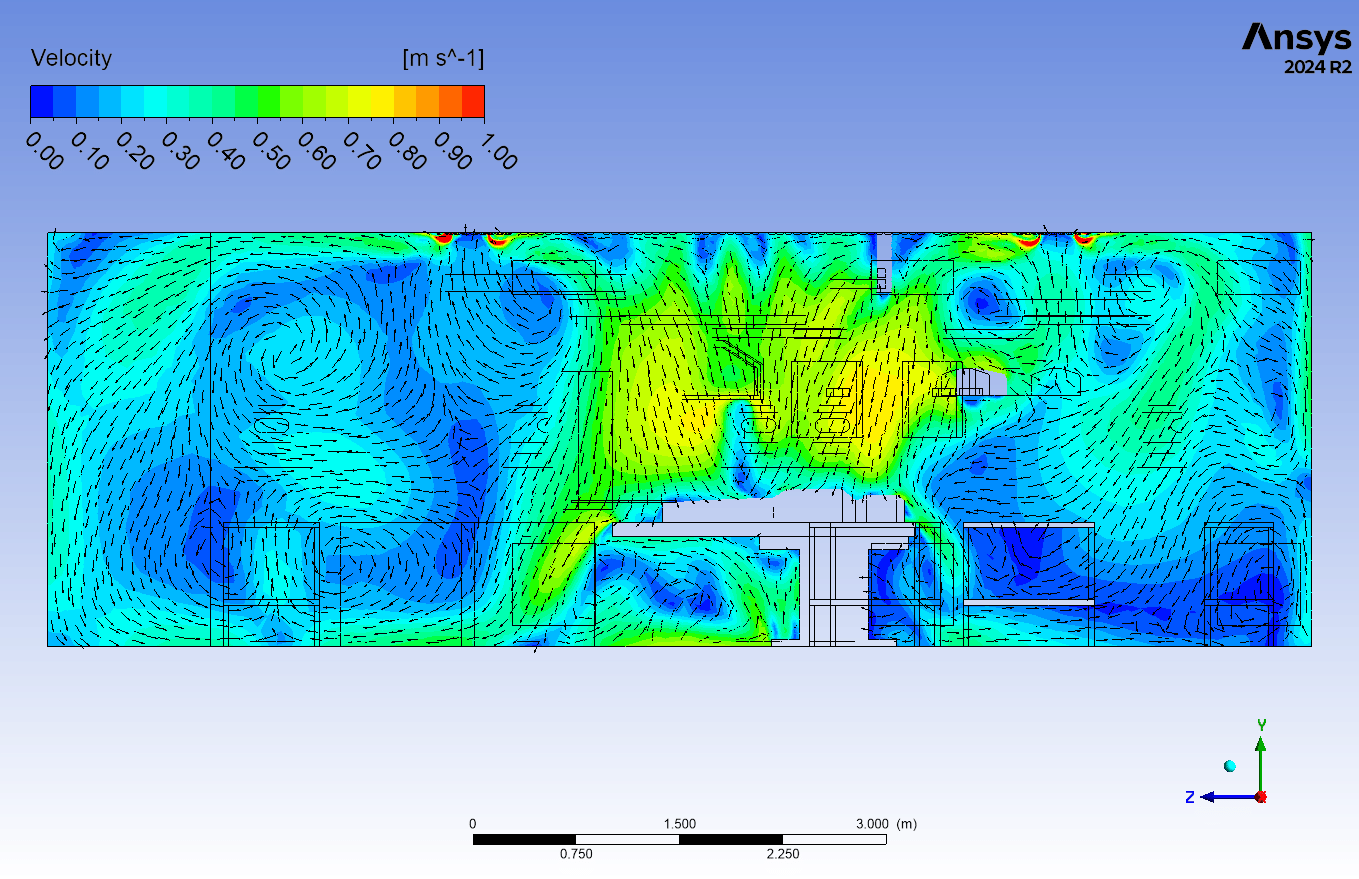 CFD enables to simulate airflow, temperature distribution, and particle transport in virtual models of hospital rooms. It reveals hidden problem areas like stagnant air zones or unintended airflow paths that could carry contaminants. With these insights, designers can optimize ventilation layouts, diffuser positions, and air change rates to meet hygiene standards and improve patient safety before the facility is even built.