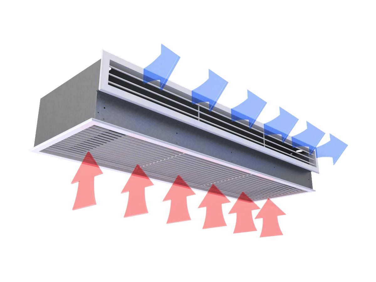 The active chilled beam system circulates air from the room throughout its heat exchanger where the supply air is either cooled or heated before being diffused back to the room through the system’s nozzles. Fresh ventilation air is delivered to the beam by a central air-handling system via ductwork.